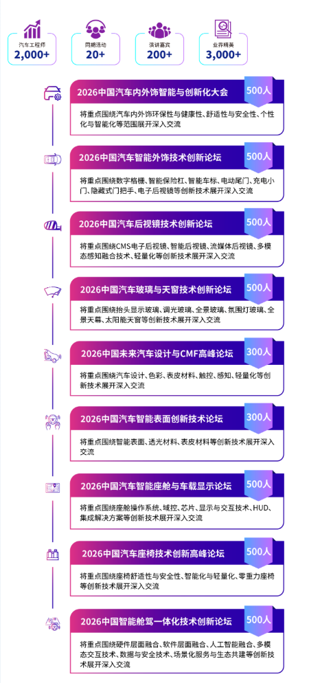 不止于产品展示,本届展会更精心策划多场主题高峰论坛与技术研讨会。力邀数十位来自全球顶尖主机厂技术领袖、知名设计师与学术专家倾力分享,深度聚焦智能汽车内外饰技术、智能座舱、舱驾一体化、汽车设计与 CMF及可持续材料、前沿工艺等核心议题。共议技术变革路径与产业未来趋势。